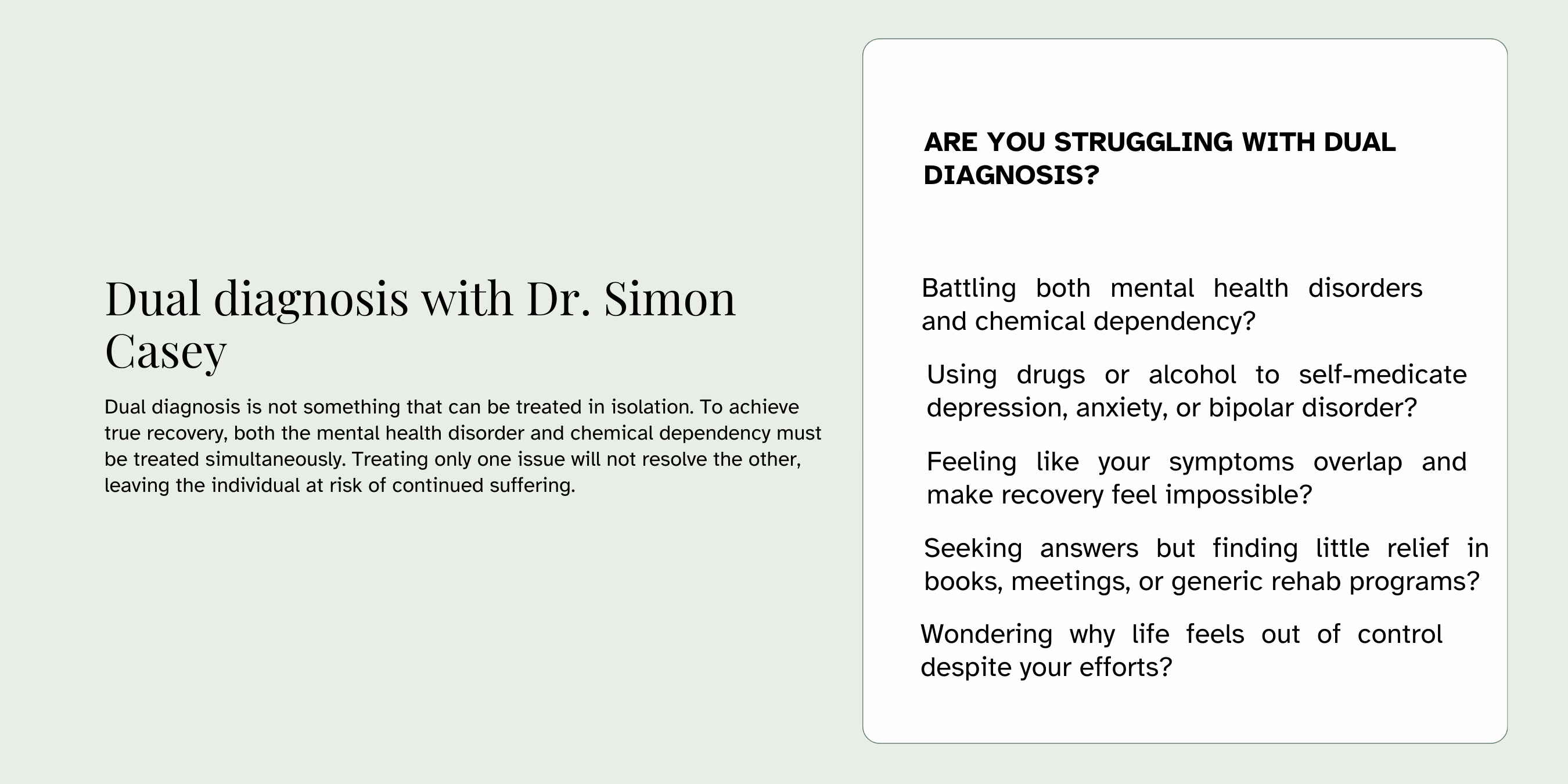 Dual diagnosis refers to the presence of both a mental health disorder and chemical dependency. Conditions like depression, anxiety, or bipolar disorder, when combined with substance abuse, create a complex and challenging situation. Often, mental health issues arise first, and individuals turn to drugs or alcohol to self-medicate, not realizing that this behavior can lead to addiction.